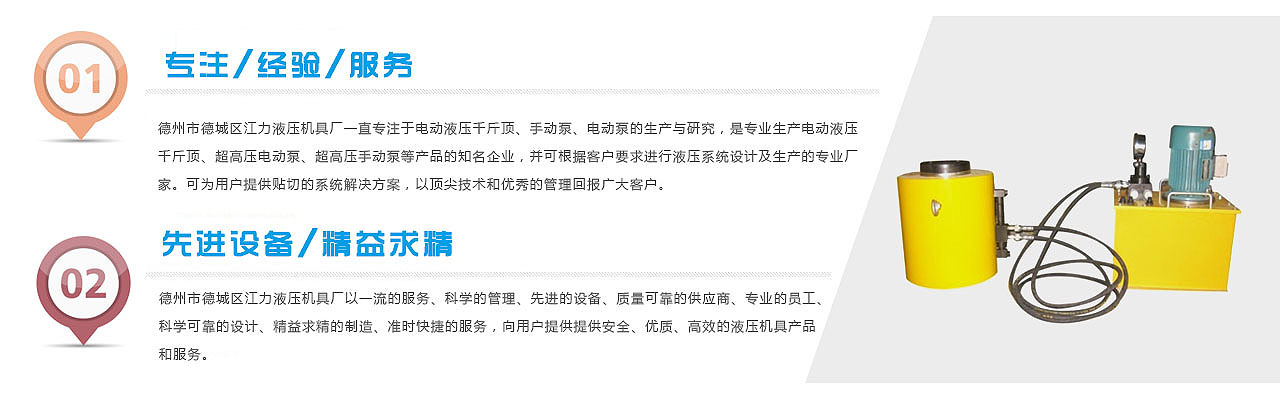 德州市德城區江力液壓機具廠一直專注于電動液壓千斤頂、手動泵、電動泵的生產與研究,是專業生產電動液壓千斤頂、超高壓電動泵、超高壓手動泵等產品的知名企業,并可根據客戶要求進行液壓系統設計及生產的專業廠家。可 為用戶提供貼切的系統解決方案,以頂尖技術和優秀的管理回報廣大客戶。